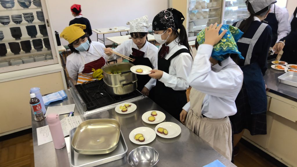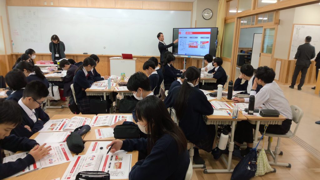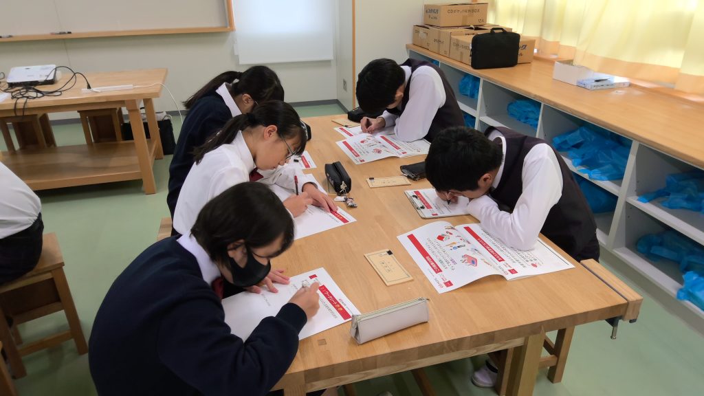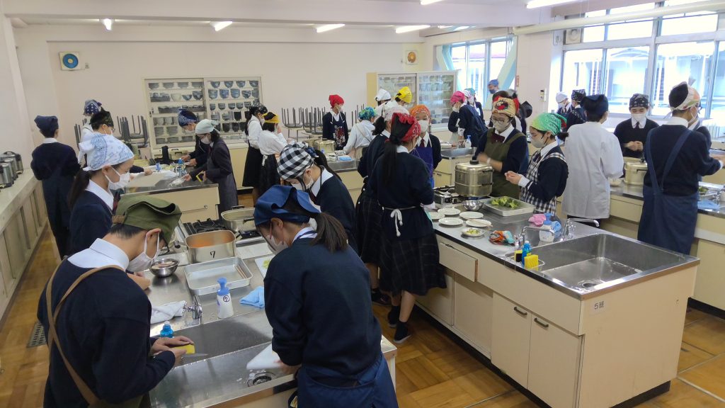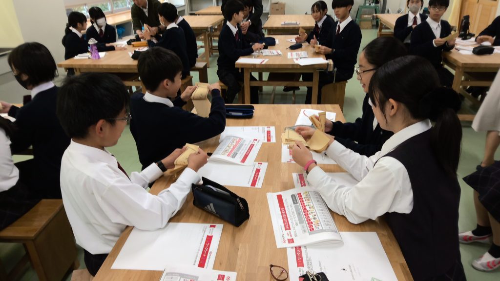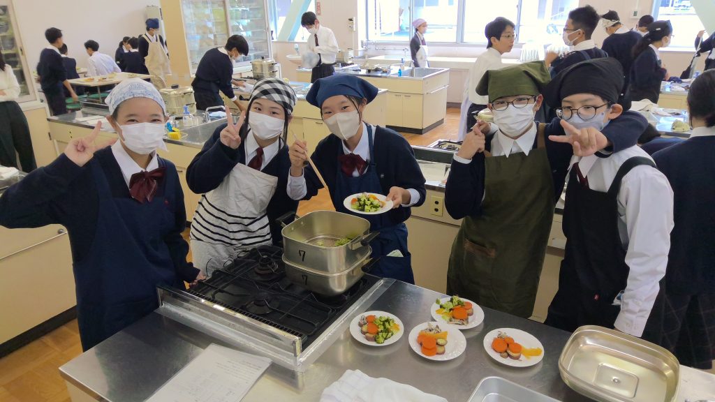本日の午前は、2組が調理実習を行いました。2組の生徒にとって初めての調理実習でしたが、班で協力し、手際よく調理を進めることができました。とても楽しそうに取り組む姿が印象的でした。また、午後からは、三菱UFJ銀行の皆様をお招きし、出張講座を実施していただきました。2時間構成で実施し、1時間は金融についての学習、もう1時間はキャリア教育の一環として、数名の銀行員の皆様にインタビューをさせていただきました。現在、総合的な学習の時間で「職業探究」を実施している時期ということもあり、職業観等について、様々な視点で質問する姿がありました。