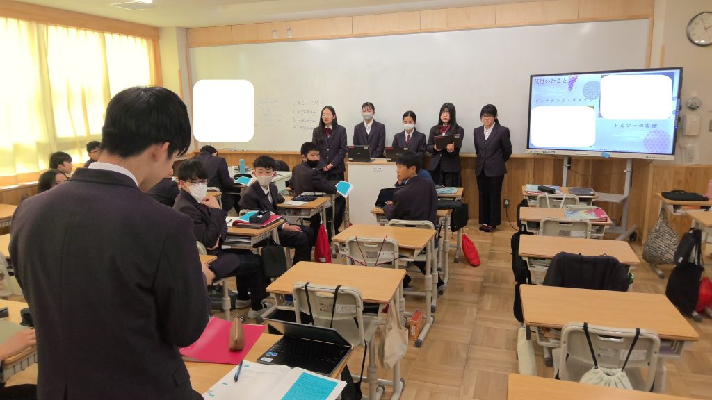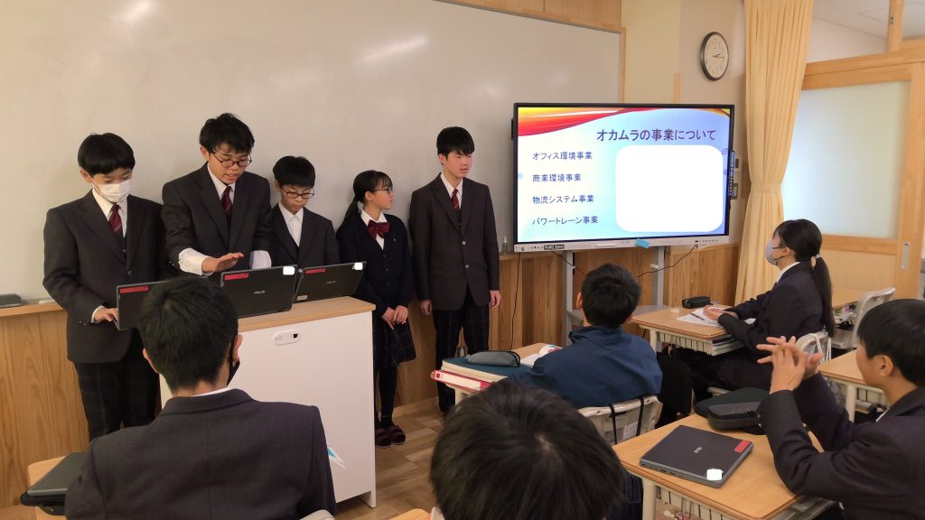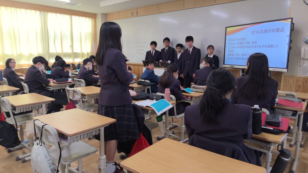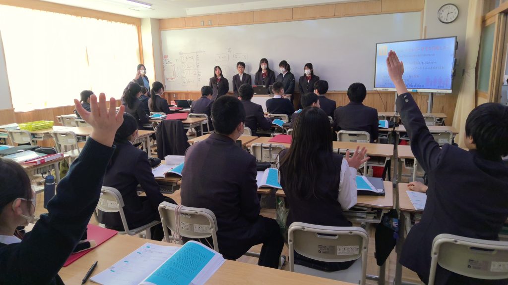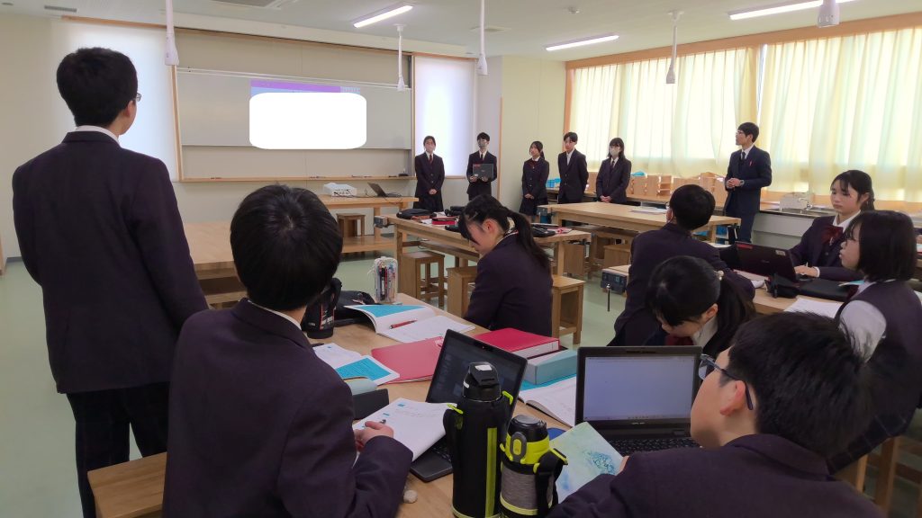 生徒たちは、冬休みの課題の一つとして、各インターン先の企業において、その企業が社会に生み出す価値について探究しました。本日は、刈谷市内の教頭先生が参観される中で、探究の成果を発表しました。5時間目は「プレ発表」と位置づけ、各班が互いに発表する中で、気づいたことを伝え合いました。6時間目は再度各班で修正する時間を設け、来週の授業参観の「本発表」に向けて、準備を進めました。本日の生徒たちの姿は、「互いに支え合い高め合う」といった本校の生徒像を現しているかのように、気づいたことを進んで伝え合う姿があり、確かな成長を感じました。