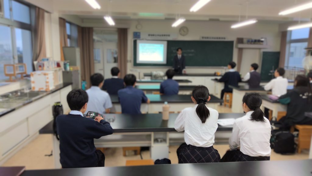 本日は、中学生と高校生の希望者を対象に、SS特別講座が開かれました。授業後の開催ではありましたが、参加を希望する中学生が、高校生とともに、講座に参加する姿がありました。電気協会に所属する企業の社員をお招きし、電気の魅力についての講義を受けました。参加した生徒からは、「電気会社から家庭への電気の送り方がいろいろあり、マイクログリットネス事業というものがあることを知った」「水素エネルギーの仕組みや、そのメリット・デメリットを知ることができた」などの感想がありました。「とても難しかったけれど、こうした話が難しいと感じなくなるように、これからの学習を頑張っていきたい」「次もこうした機会があれば参加したい」という前向きな言葉を聞くことができました。興味・関心のあることに進んで参加できる姿を素晴らしく思います。
