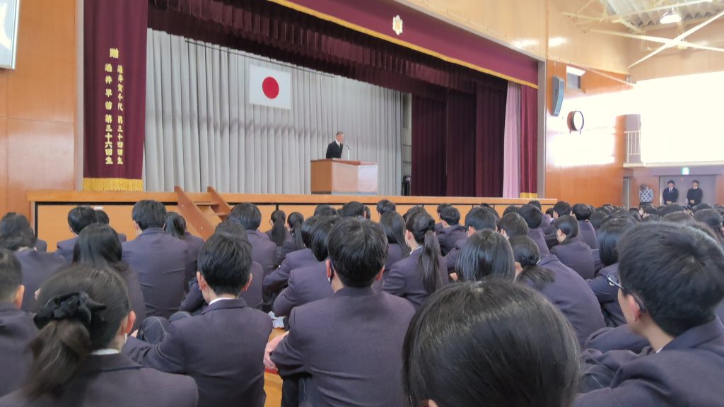 本日は、中高合同で始業式を実施しました。有賀校長のお話は、共通テストに向けて、高校3年生に向けた激励の言葉とともに、全校生徒に対し、新年の目標を掲げてスタートしてほしいとする内容でした。また、その後の中学校の指導講話では、各担当の先生から、3学期は2年生に向けた「0学期」として、しっかり準備をしてほしいこと、何よりも日々の授業を大切にしてほしいこと、3月の附属中体育祭を生徒たちの手で成功させてほしいことなどの話がありました。真剣に話を聞く姿から、今後の皆さんの活躍に期待しています。