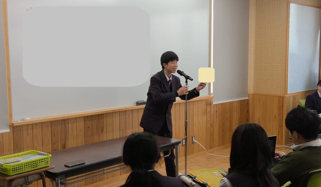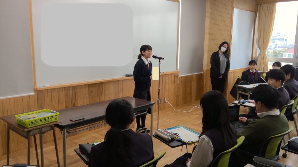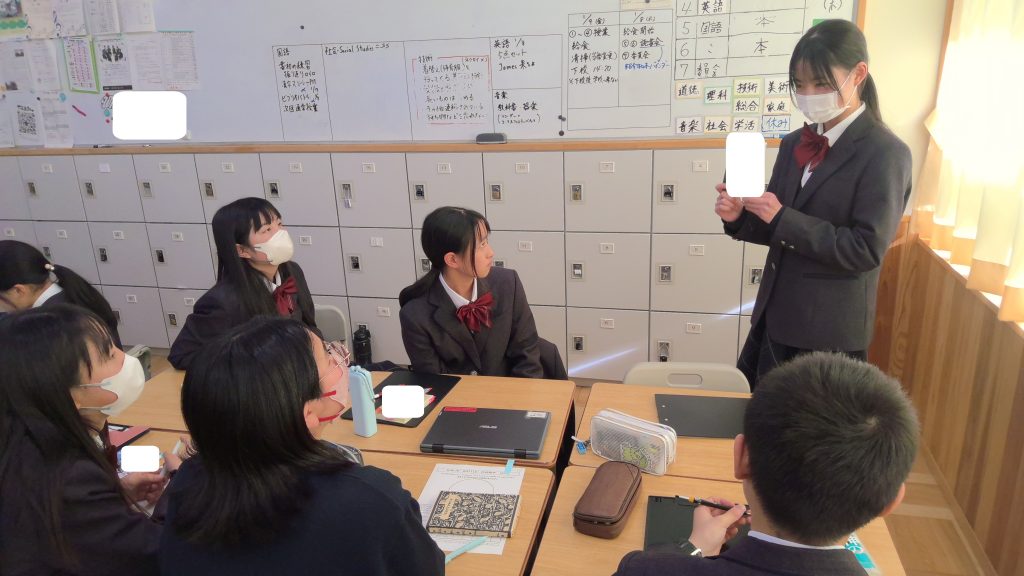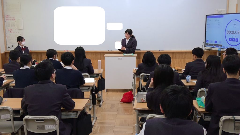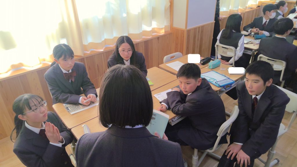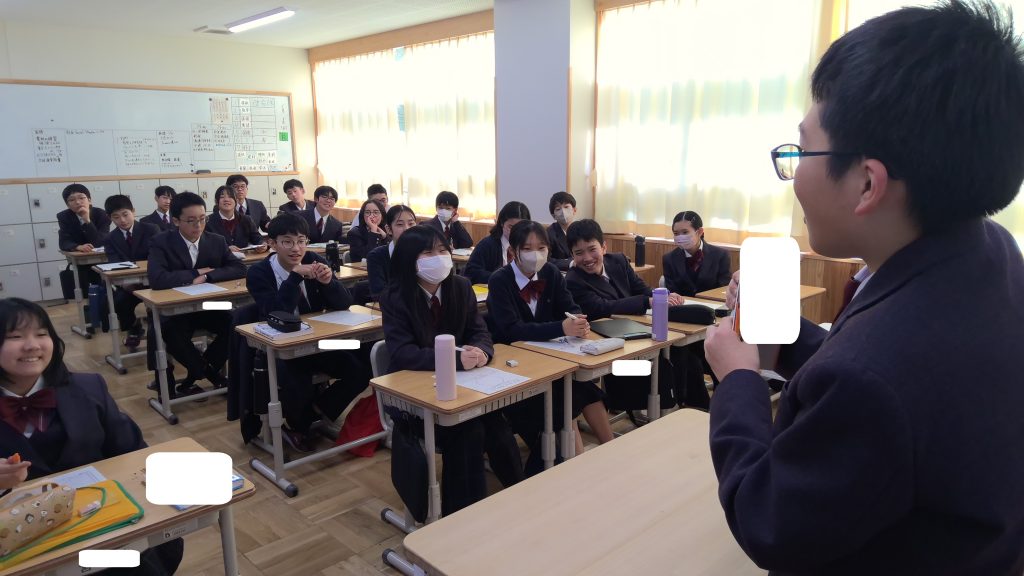 本日は、読書会として、ミニビブリオバトルを実施し、各学級にて、班内予選、学級内予選を行いました。生徒は、冬休み中に、あらかじめ自分が推薦したい本を決め、3分間で紹介できるように準備しました。生徒たちは、これまでの探究活動を通して、様々な場面で発表する機会を経験し、表現力を高めてきました。本の紹介においても、「皆さんは、〇〇について知っていますか」「私は△△と感じましたが、皆さんも同じように感じたことがあるのではないでしょうか」など聞き手を引き付け、共感を得られるように話し方を工夫する姿が多く見られ、確かな成長を感じました。参観された高校の先生からも、「中学1年生とは思えないほど素晴らしいかった」と感想をいただきました。