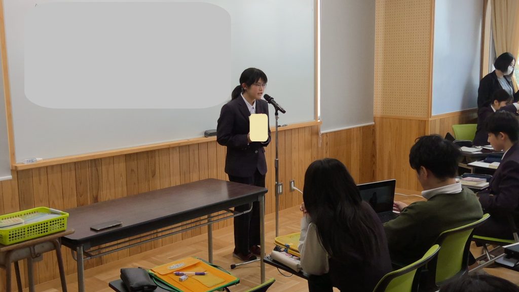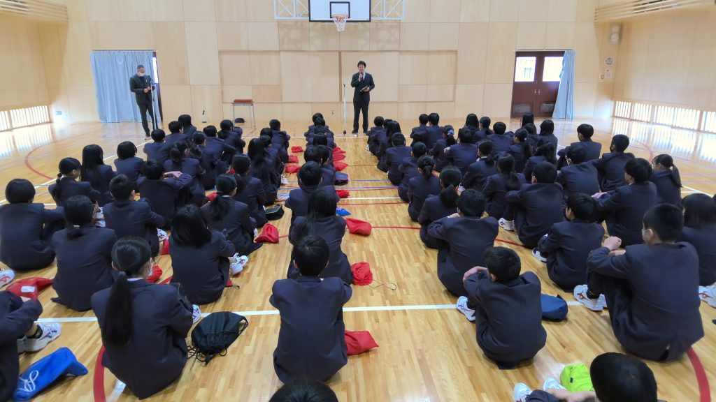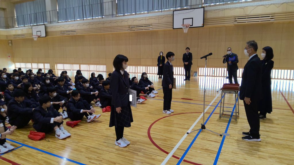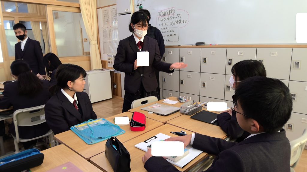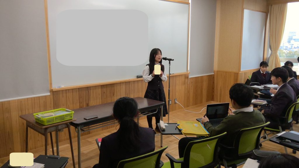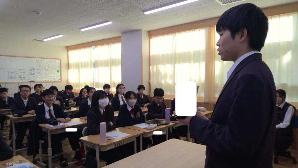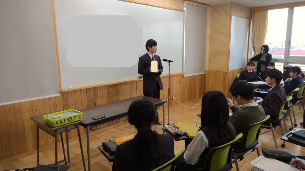 本日は、読書会として、ミニビブリオバトルを実施し、各学級にて、班内予選、学級内予選を行いました。生徒は、冬休み中に、あらかじめ自分が推薦したい本を決め、3分間で紹介できるように準備しました。生徒たちは、これまでの探究活動を通して、様々な場面で発表する機会を経験し、表現力を高めてきました。本の紹介においても、「皆さんは、〇〇について知っていますか」「私は△△と感じましたが、皆さんも同じように感じたことがあるのではないでしょうか」など聞き手を引き付け、共感を得られるように話し方を工夫する姿が多く見られ、確かな成長を感じました。参観された高校の先生からも、「中学1年生とは思えないほど素晴らしいかった」と感想をいただきました。