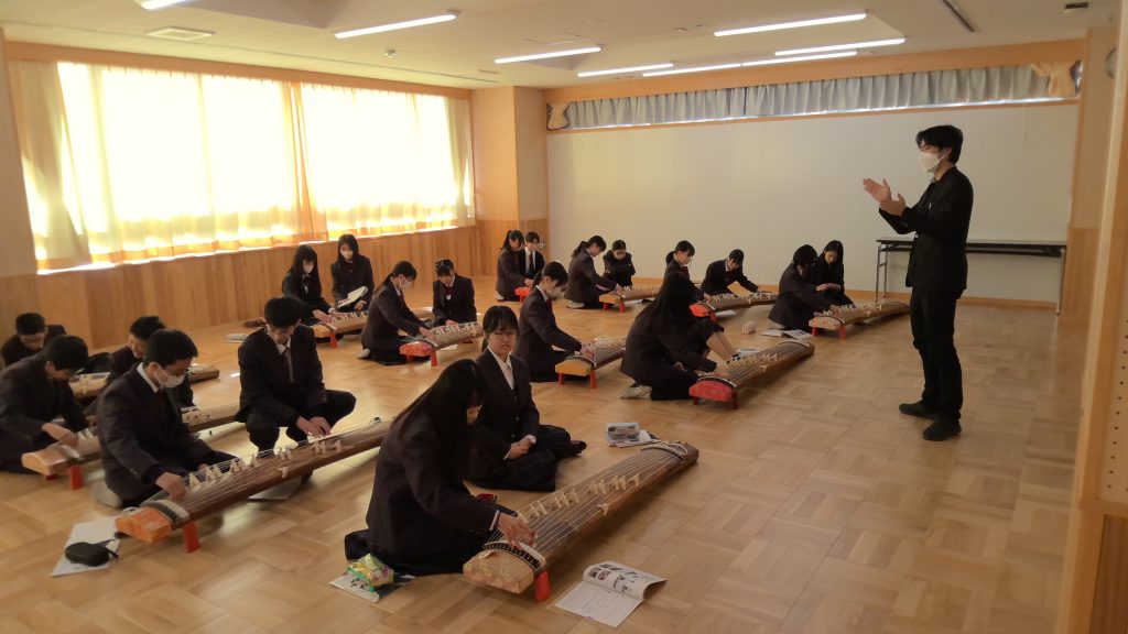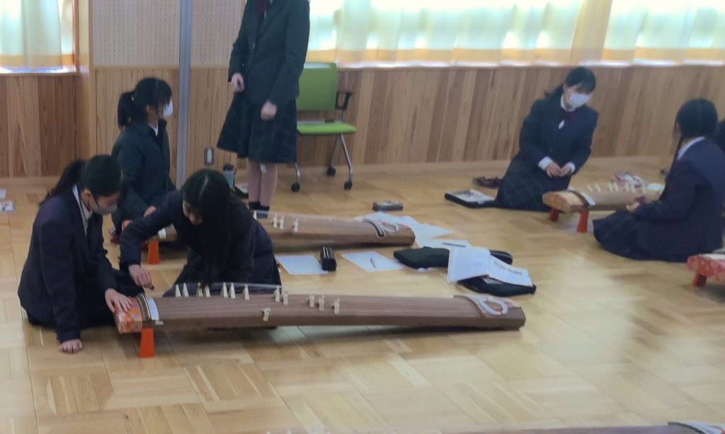 現在、音楽の授業では、箏を用いた創作活動を行っています。生徒たちは前時までに、箏の前で正座し、箏爪をはめて演奏の練習を行ってきました。その後、曲をアレンジする創作活動に入っています。創作の仕方として、インターネットで情報収集を行ったり、実際に箏を触りながらアレンジを考えたりする姿がありました。音楽の授業においても、課題解決に向けて真剣に取り組む様子が伺えます。