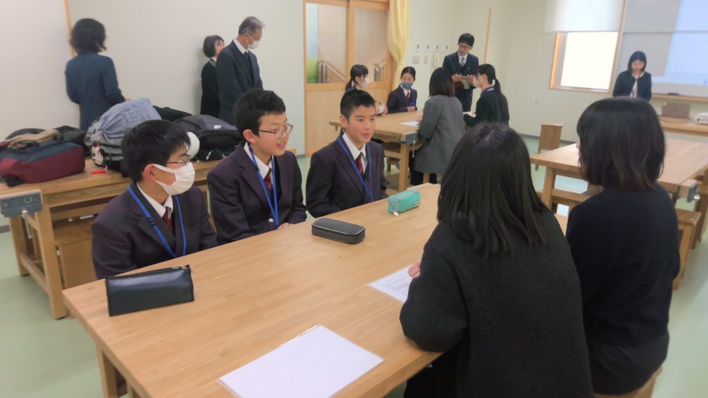 本日の授業後に、特定非営利活動法人「くるくる」で働く皆様をお招きし、本校の生徒との交流会を実施しました。本校の生徒に希望を募ったところ、8名の生徒が参加することになりました。まずは、各グループで、くるくるの皆様から自己紹介や働く上で大切にしていることをお話いただきました。それに対して、中学生が質問する流れの中で、意見交流が活発に進みました。「互いの意見を肯定的に受け止め、意見の違いを楽しむ」ことをテーマに会が進んだことから、終始、温かい雰囲気で交流会が行われました。生徒からは「働くということは、自分のしたいことを行うことが大事であると感じた」「実際に働く方と、本音で語り合えてうれしかった」などの感想がありました。