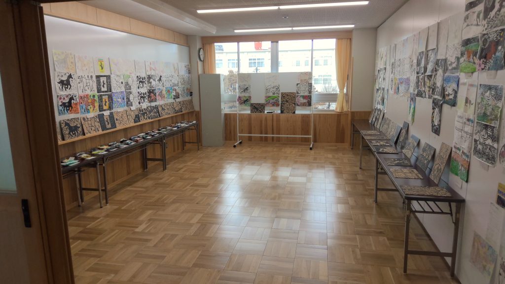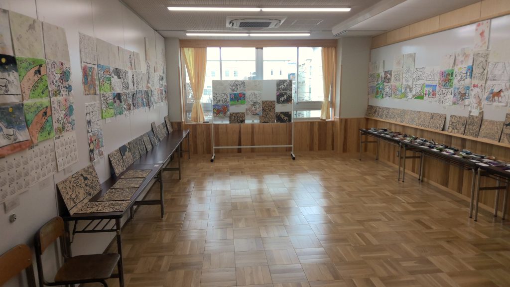 また、美術の授業の終盤には、2日(月)授業参観に向けて、仕上げた作品の展示を行いました。これまでに制作した作品が、3階に展示されていますので、保護者の皆様におかれましては、授業参観にお越しの際に、ぜひ3階にお立ち寄りいただけますと幸いです。